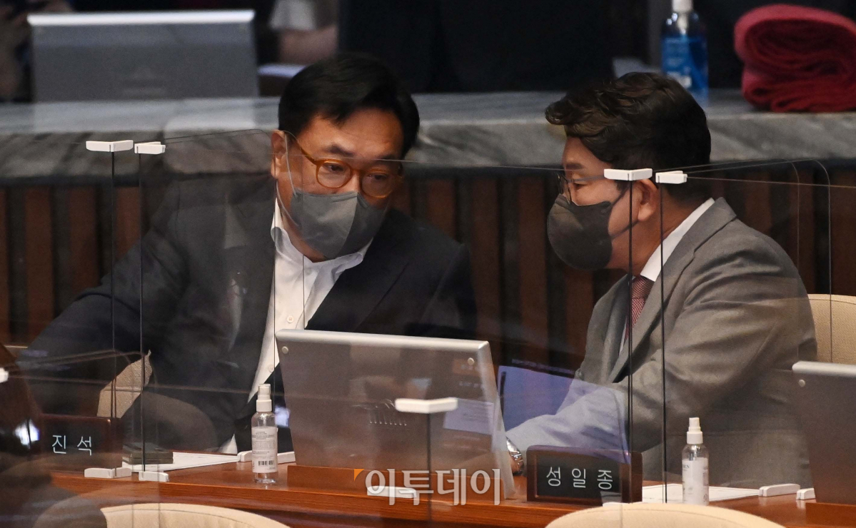권성동 국민의힘 원내대표(오른쪽)와 정진석 국회부의장이 7일 서울 여의도 국회에서 열린 본회의에서 대화를 하고 있다.