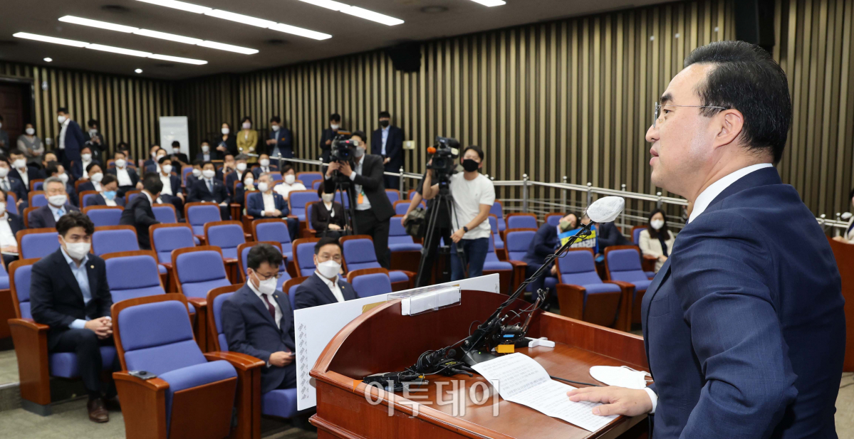 더불어민주당 박홍근 원내대표가 7일 오후 서울 여의도 국회에서 열린 의원총회에서 발언하고 있다.