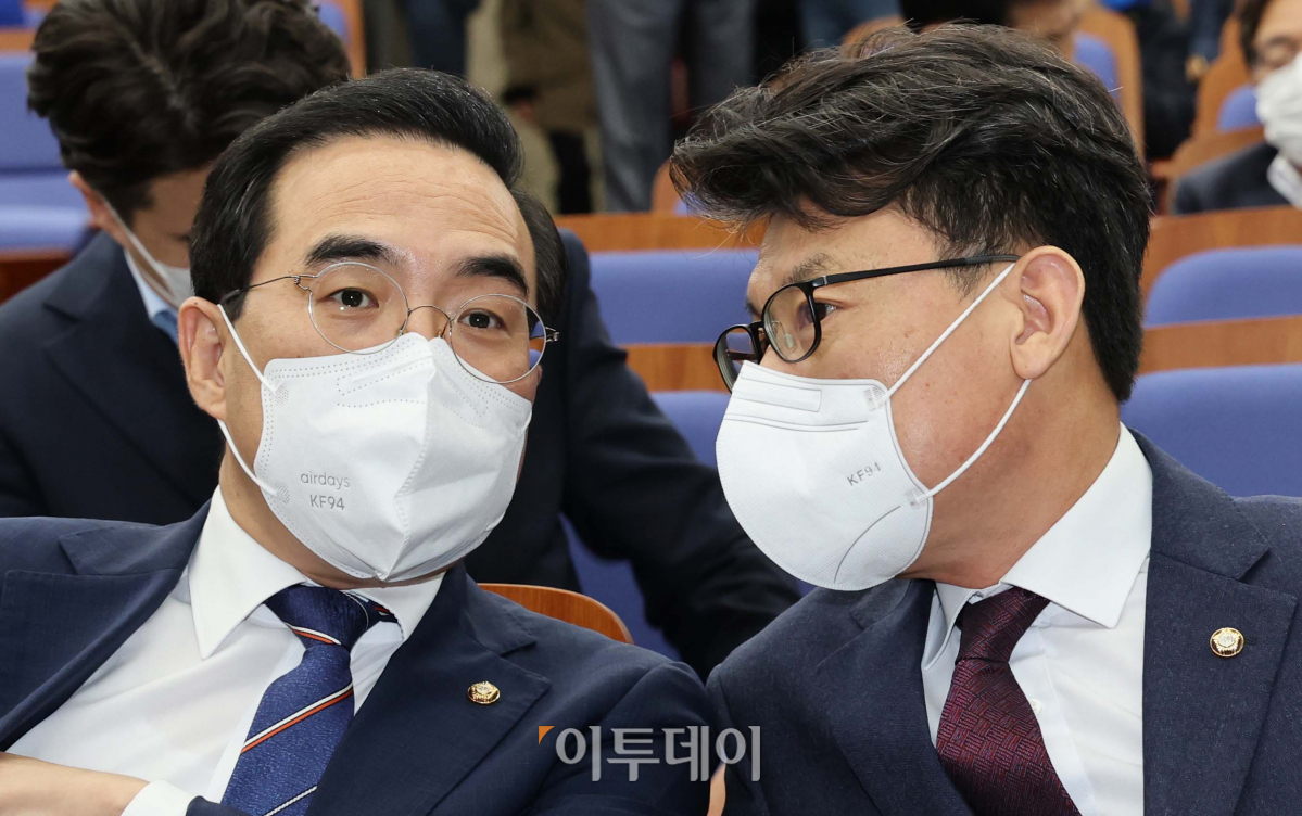 더불어민주당 박홍근 원내대표와 진성준 원내수석부대표가 7일 오후 서울 여의도 국회에서 열린 의원총회에서 대화하고 있다.