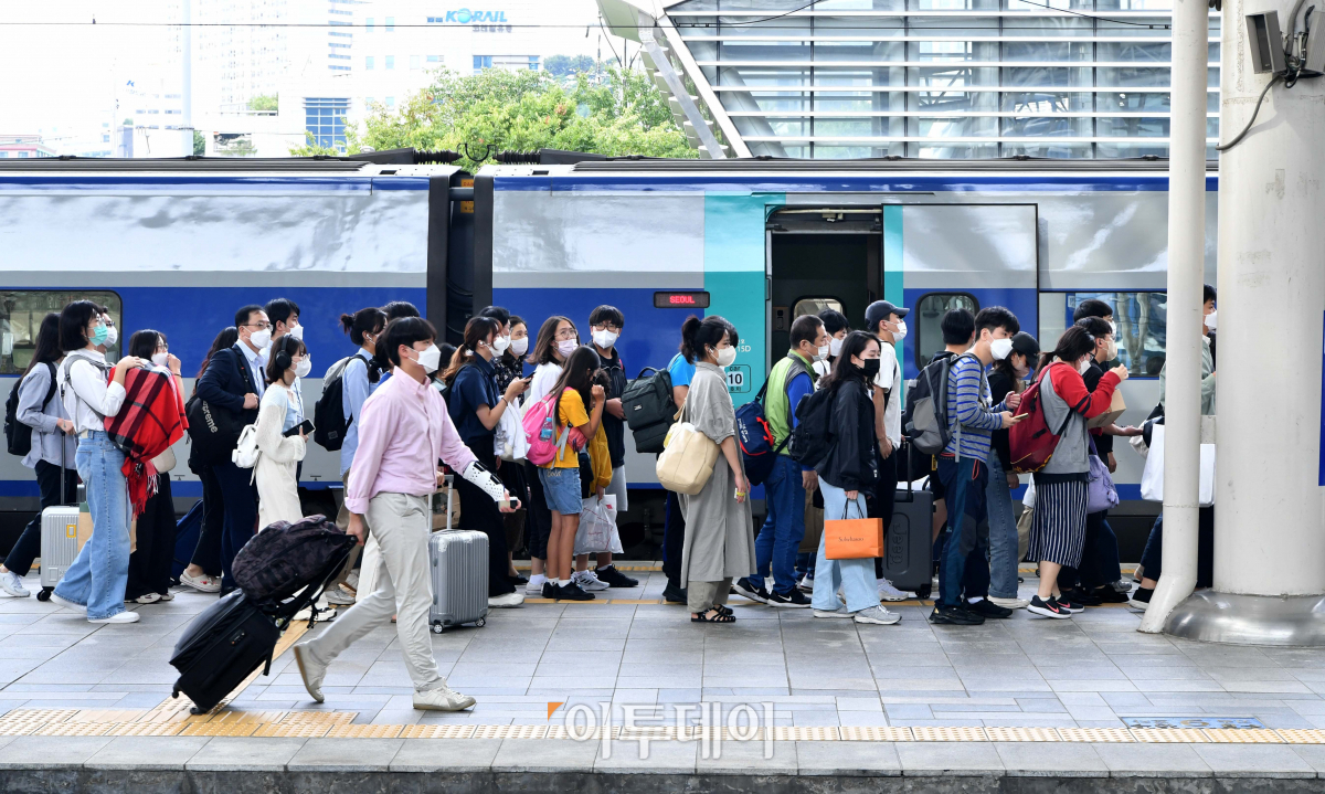 추석 연휴 마지막 날인 12일 오전 서울역에 도착한 귀경객들이 발걸음을 옮기고 있다.