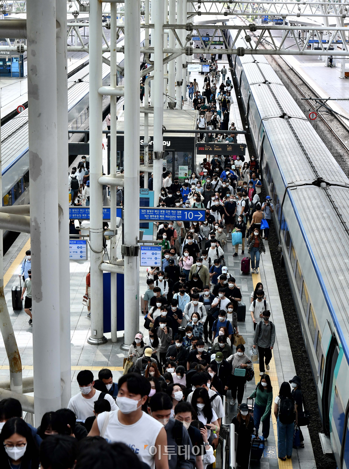 추석 연휴 마지막 날인 12일 오전 서울역에 도착한 귀경객들이 발걸음을 옮기고 있다.