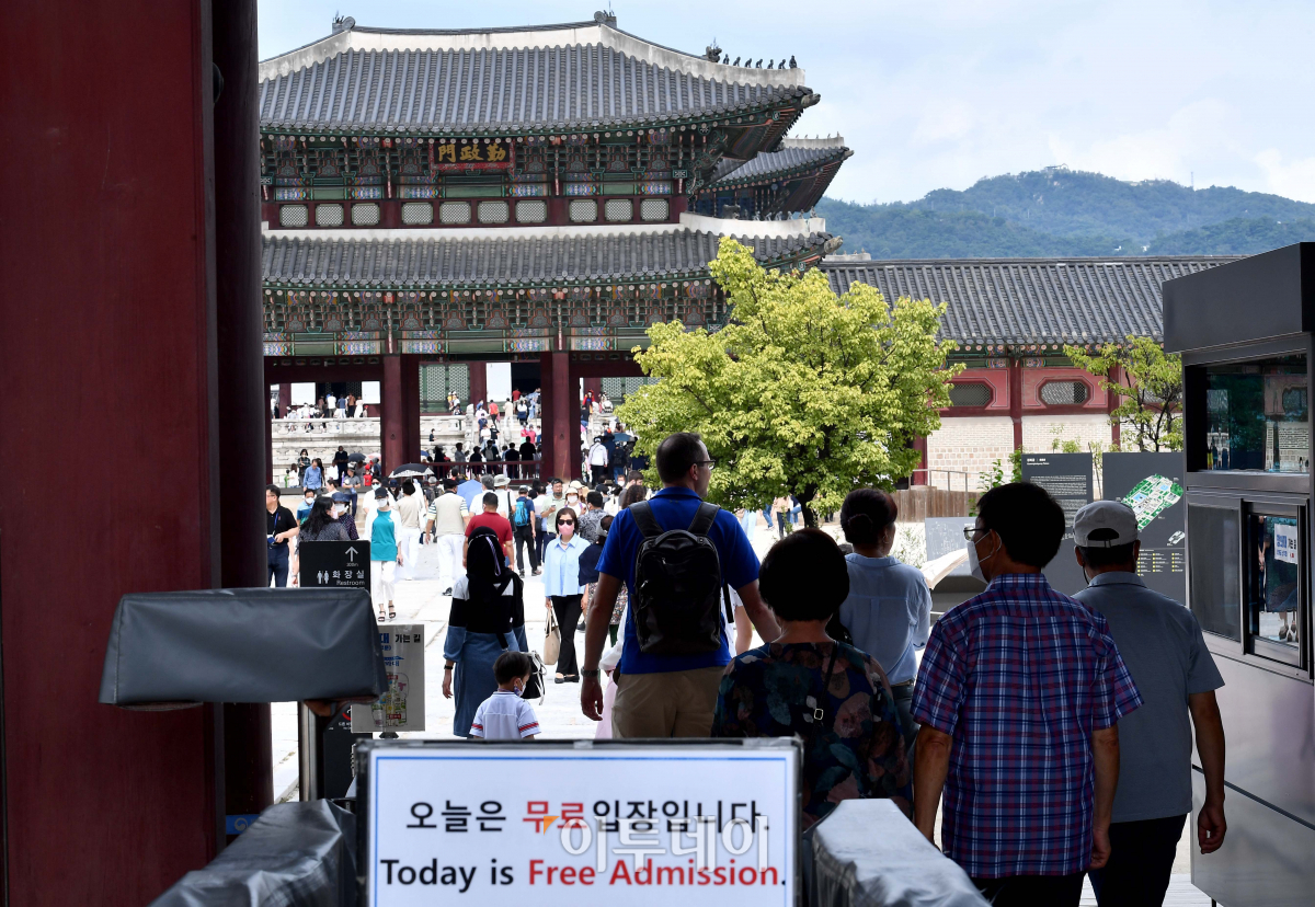 추석 연휴 마지막 날인 12일 서울 경복궁을 찾은 시민들이 고궁의 정취를 만끽하고 있다.