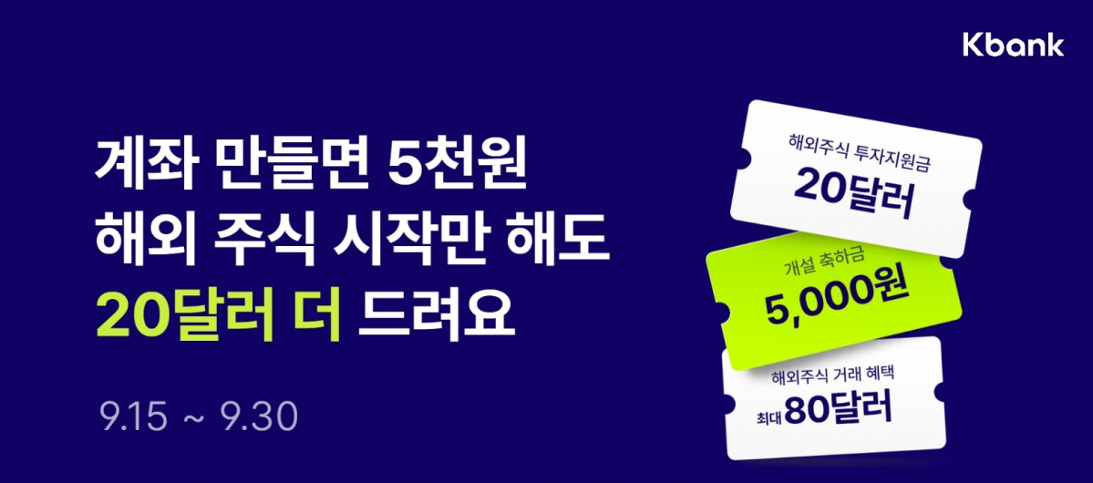 케이뱅크는 오는 30일까지 삼성증권 계좌를 최초로 개설하는 고객에게 개설축하금 5000원(선착순 1만 명)과 국내주식거래 수수료 평생 우대 혜택을 제공한다.