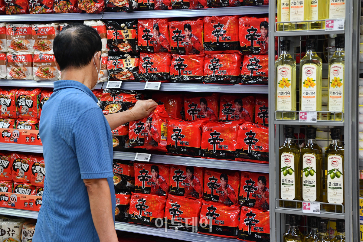 국제 곡물 가격 상승과 원·달러 환율 급등에 농심과 오리온이 주요 제품 가격을 인상한 15일 서울의 한 대형마트에서 시민이 신라면을 살펴보고 있다. 농심은 이날부터 신라면 등 26개 라면류 가격을 평균 11.3%, 오리온은 초코파이 등 16개 제품 가격을 평균 15.8% 인상했다. 업계 1위인 농심과 오리온이 값을 올리자 다른 식품기업들의 추가 가격 인상까지 전망되며 물가 상승 부담이 커지고 있다.