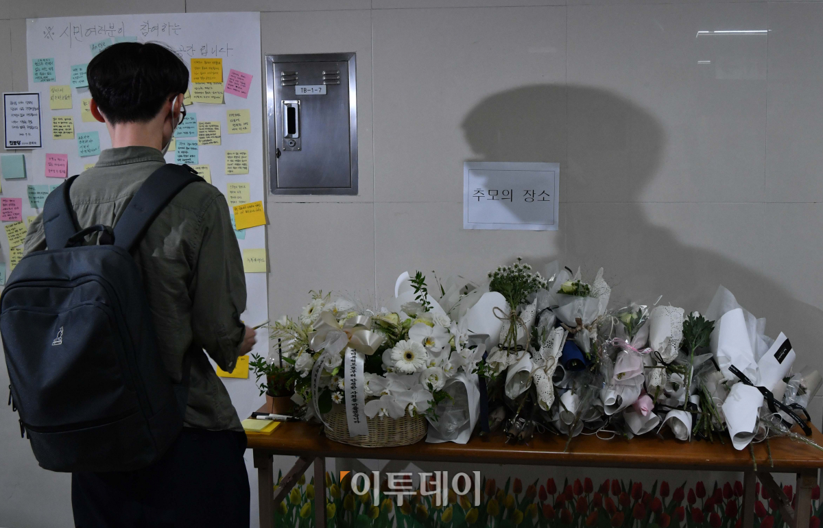 16일 서울 중구 신당역에 마련된 ‘신당역 스토킹 살인 사건’ 추모공간에 시민들의 추모 행렬이 이어지고 있다.