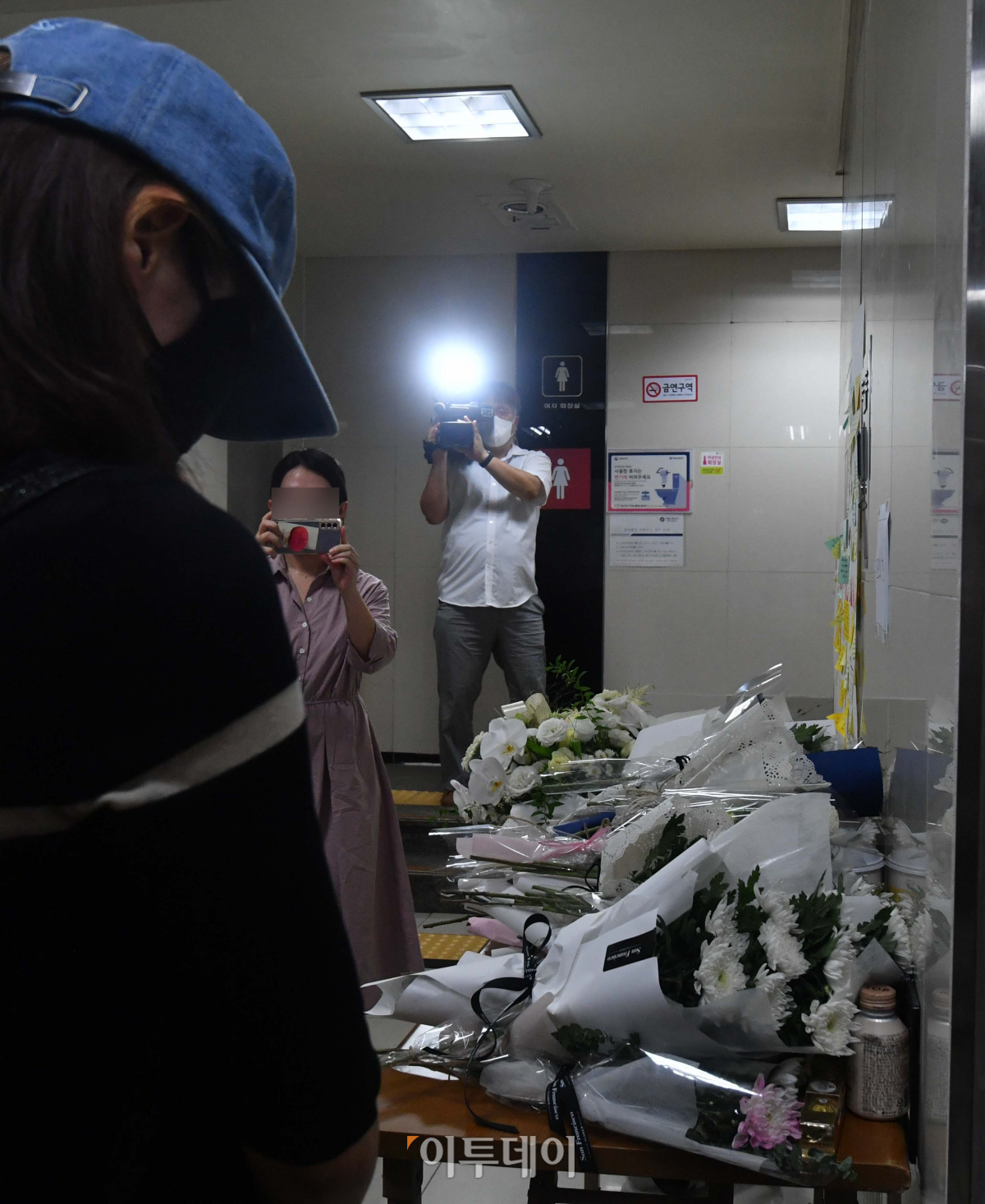 16일 서울 중구 신당역에 마련된 ‘신당역 스토킹 살인 사건’ 추모공간에 시민들의 추모 행렬이 이어지고 있다.