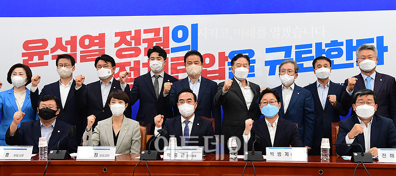 박홍근(앞줄 가운데) 더불어민주당 원내대표가 19일 서울 여의도 국회 원내대표 회의실에서 열린 윤석열정권 정치탄압대책위원회 전체회의에서 박범계(앞줄 오른쪽 두번째) 위원장 등 참석자들과 기념촬영을 하고 있다.