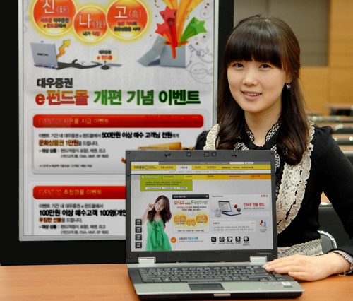 한편, 대우증권은 5월말까지 e펀드몰 개편을 기념해 고객사은 이벤트를 진행한다. 이번 이벤트는 500만원 이상 e펀드몰에서 금융상품을 매수한 고객 전원에게 문화상품권을, 100만원 이상 매수한 고객 중 100명에게는 추첨을 통해 LCD TV, 노트북, MP3, 문화상품권 등을 제공한다.