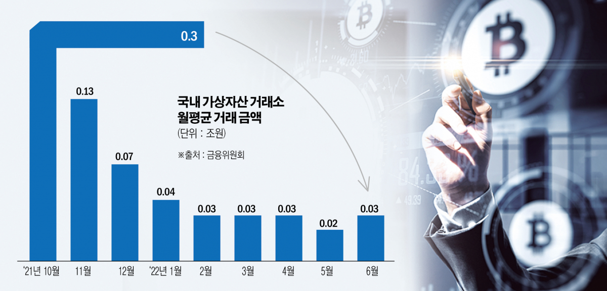 금융위원회는 26일 35개 가상자산사업자를 대상으로 실시한 2022년 상반기 실태조사 결과를 발표했다. 조사결과, 하반기 대비 시가총액, 거래금액, 거래소 이용자 수 모두 크게 쪼그라들었다.