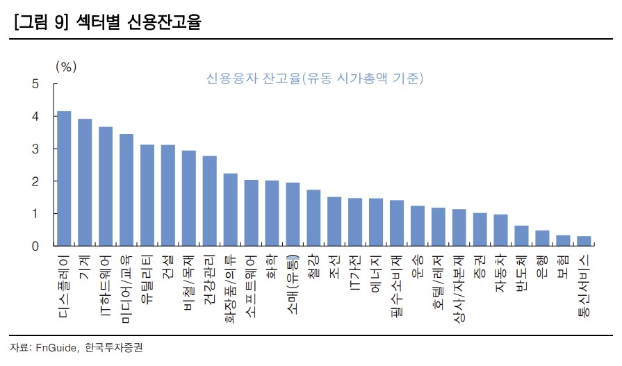 신용융자와 반대매매 가능성을 첫 번째 우려 요인으로 꼽았다. 그는 "여전히 신용잔고율이 높다는 점은 수급 측면의 부담으로 작용한다. 특히 유동 주 식수 기준의 신용잔고율은 올해 주가 하락에도 불구하고 충분히 낮아지지 않은 상태"라며 "신용 융자율이 5% 이상인 기업의 시가총액 비중은 오히려 연고점과 큰 차이가 없다는 점에서, 반대매매로 인한 주가지수 하락 확대 우려가 존재한다"고 했다.