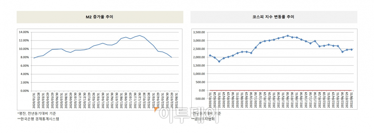 코스피 지수의 증가율이 마이너스(-) 전환한 것은 올해 1월 28일(-10.51%)이다. 1월 이후 현재까지 증가율 추이는 줄곧 마이너스다. M2증가율은 지난 4월부터 꺾였다. 4월에 집계된 M2증가율 추이는 9.44%로 10% 밑으로 떨어졌다. 이후 하락세를 이어가더니 7월에는 7.98%까지 좁혀졌다.