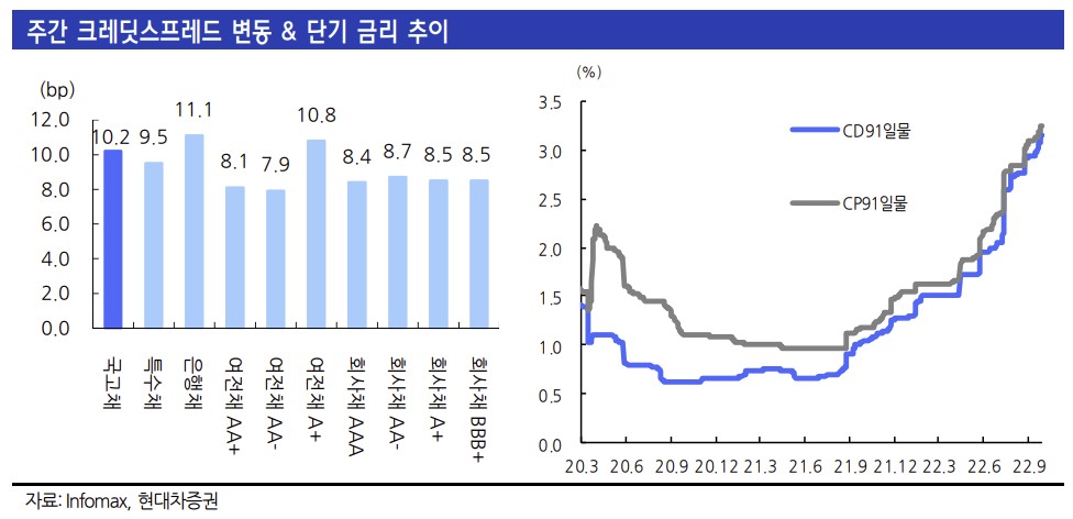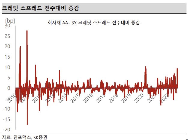 이는 코로나19 팬데믹(2020년 4월 10일 기준 전주 대비 10.3bp)과 2010년 금융위기(2010년 12월 7일 기준 전주 대비 27.6bp) 수준의 확대 폭으로 사실상 회사채 시장이 패닉 상태를 보이고 있는 셈이다.
