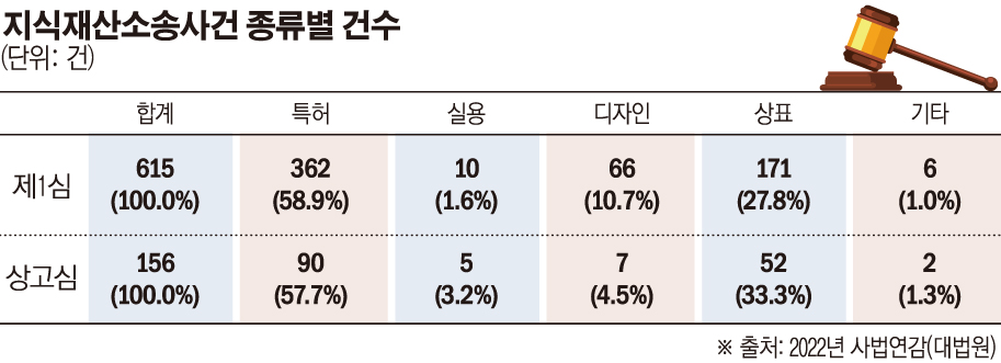 이 중 제1심에서 처리한 지식재산 소송사건 615건 가운데 특허 분쟁 사건은 362건으로 58.9%를 차지했다. 이어 상표권 다툼이 171건으로 27.8%였다. 디자인 66건(10.7%), 실용 10건(1.6%) 등 순이다.