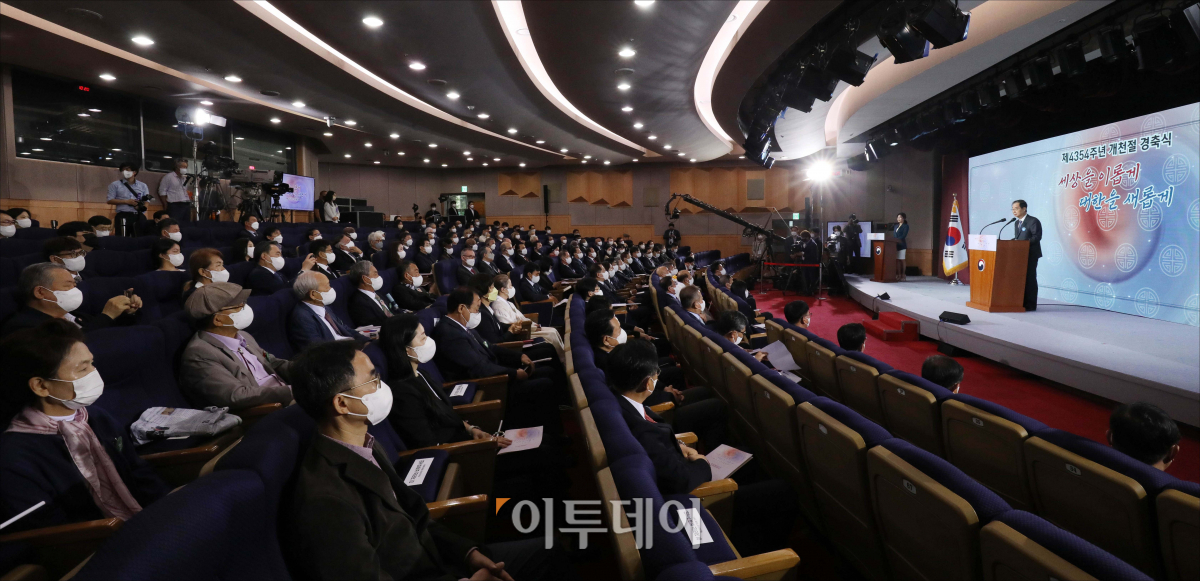 한덕수 국무총리가 3일 오전 서울 종로구 정부서울청사 별관 대강당에서 열린 제4354주년 개천절 경축식에서 경축사를 하고 있다. 사진공동취재단