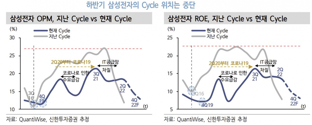 다만 "2023년 실적 눈높이는 추가적으로 하향될 수 있다. 매크로 하강에 따라 세트(스마트폰, TV 등) 판매 둔화와 메모리 반도체 가격 하락 때문"이라며 "사업부별 영업이익은 반도체 6조 원(-39.8%), MX(무선) 3조 원(+13.6%), DP 1조9000억 원(+78.8%), CE 3000억 원(-13.8%)으로 추정한다"고 했다.