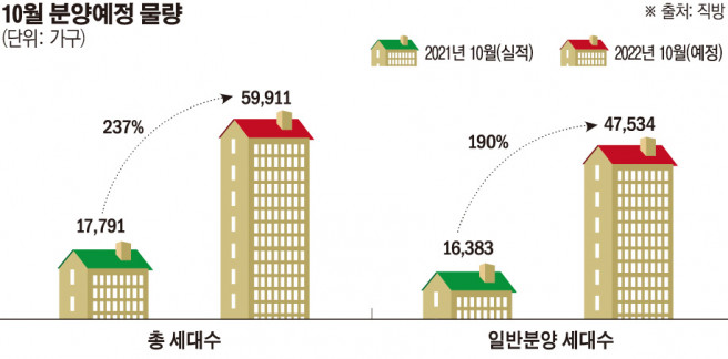 4일 직방 조사에 따르면 이달 전국 74개 단지에서 5만9911가구(임대·사전청약 물량 제외)가 공급되는 가운데 4만7534가구가 일반분양을 준비하고 있다. 이는 총 분양 예정 가구 수와 일반분양 가구 수가 전년 동월 대비 각각 237%, 190% 증가한 것이다.