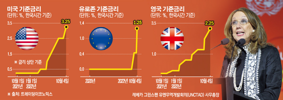 선진국이 잘못 대응한 결과는 특히 개발도상국에 치명적이다. UNTAD는 “연준의 기준금리가 1%p 인상되면 이후 3년간 다른 선진국의 국내총생산(GDP)은 0.5% 줄고, 빈곤국은 0.8% 감소한다”고 추산했다. 이어 “올해 연준의 금리 인상만으로도 빈국의 GDP가 3600억 달러 감소한다”며 “추가 긴축이 나올 경우 피해가 더 늘어날 수 있다”고 역설했다.