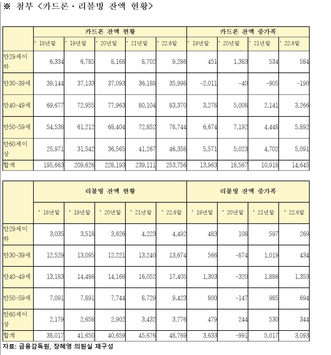 장 의원은 "카드론과 리볼빙은 모두 두 자릿수가 훌쩍 넘는 높은 수수료가 적용되는 만큼 복합위기로 어려움에 부닥친 서민이 높은 수수료의 빚에서 빠져나오지 못하고 있다"면서 "정부는 전환 대출이나 부실 채권 매입에 그칠 것이 아니라 취약층을 대상으로 적극적인 재정 지원에 나서야 한다"고 말했다.