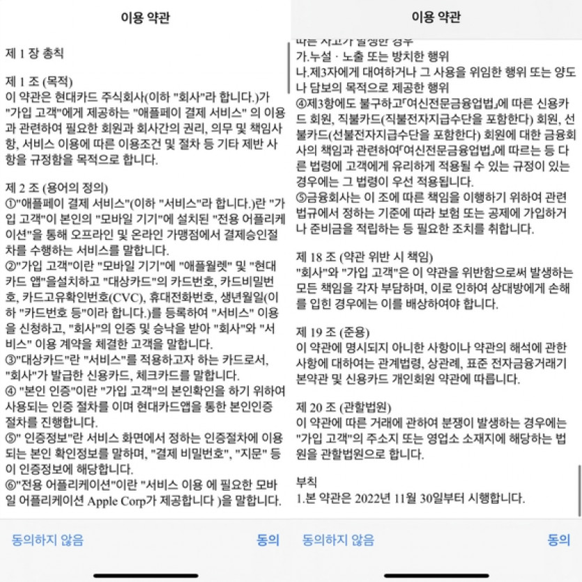 6일 업계에 따르면, 애플페이 서비스와 관련한 내용을 담은 현대카드의 약관 이미지가 온라인 커뮤니티 등을 통해 공개됐다. 아직 현대카드 홈페이지에는 공식적으로 이번 약관이 공개되지 않았다.