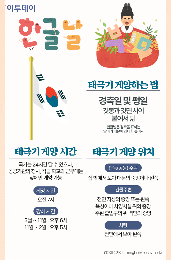 한글날은 한글의 한문 해설서인 훈민정음 해례본에 기록된 발간 시점을 전후로 한글 반포일을 임의로 추정해 지정한 날이다. 개천절, 3·1절(삼일절), 광복절, 제헌절과 함께 대한민국 5대 국경일의 하나로, 역사적인 의미가 깊은 날인만큼 태극기를 다는 것이 좋다.