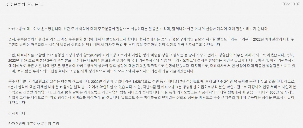 이날 윤 대표는 카카오뱅크 홈페이지에 "최근 주가 하락에 대해 주주분들께 진심으로 죄송하다"는 사과의 뜻을 밝히며 대표 명의의 메시지를 발표했다.