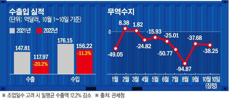 11일 관세청이 발표한 10월 1~10일 수출입 현황에 따르면 수출은 지난해 같은 기간보다 20.2% 감소한 117억 9700만 달러로 나타났다.