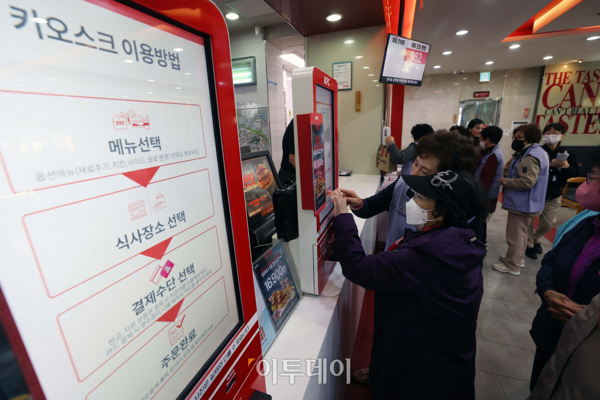 11일 서울 강남구의 한 패스트푸드 체인점에서 한 어르신이 키오스크를 이용해 음식을 주문하는 방법을 배우고 있다. 이날 강사와 어르신들은 키오스크를 함께 보며 직접 터치해 메뉴 및 결제방법을 선택하고, 주문번호 확인 후 음식을 가져오는 과정을 체험했다. 서울시는 대한어머니회와 함께 60세이상 디지털약자 500여명을 대상으로 11월까지 찾아가는 키오스크 교육을 진행한다.