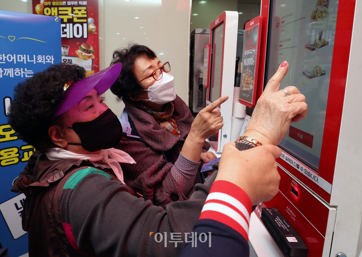 11일 서울 강남구의 한 패스트푸드 체인점에서 한 어르신이 키오스크를 이용해 음식을 주문하는 방법을 배우고 있다. 이날 강사와 어르신들은 키오스크를 함께 보며 직접 터치해 메뉴 및 결제방법을 선택하고, 주문번호 확인 후 음식을 가져오는 과정을 체험했다. 서울시는 대한어머니회와 함께 60세이상 디지털약자 500여명을 대상으로 11월까지 찾아가는 키오스크 교육을 진행한다.