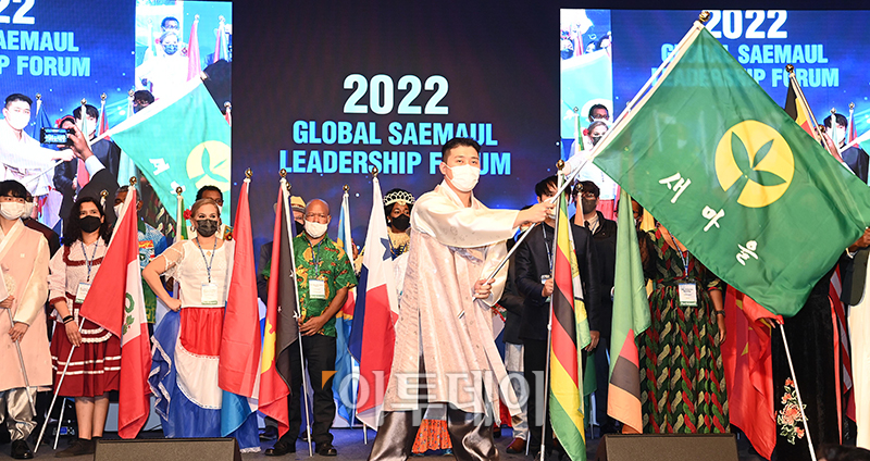 12일 서울 중구 롯데호텔에서 열린 2022 지구촌 새마을지도자대회에서 새마을운동글로벌리그(SGL) 참가국 국기 입장이 끝난 뒤 관계자가 새마을 깃발을 흔들고 있다.