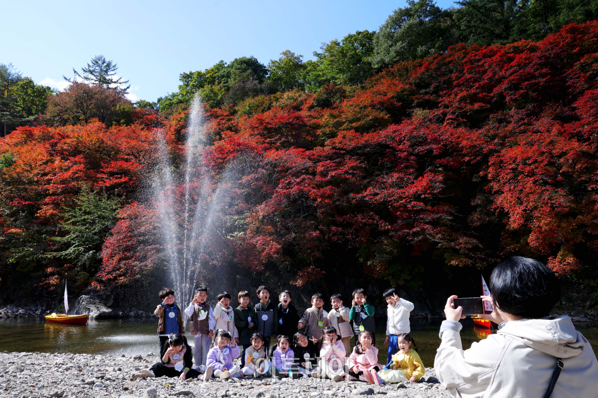 산간지방부터 단풍이 시작되며 가을이 깊어가고 있다. 13일 강원 태백시 철암단풍군락지에 붉게 물든 단풍 앞에서 소풍나온 어린이들이 기념촬영을 하며 계절의 정취를 만끽하고 있다.