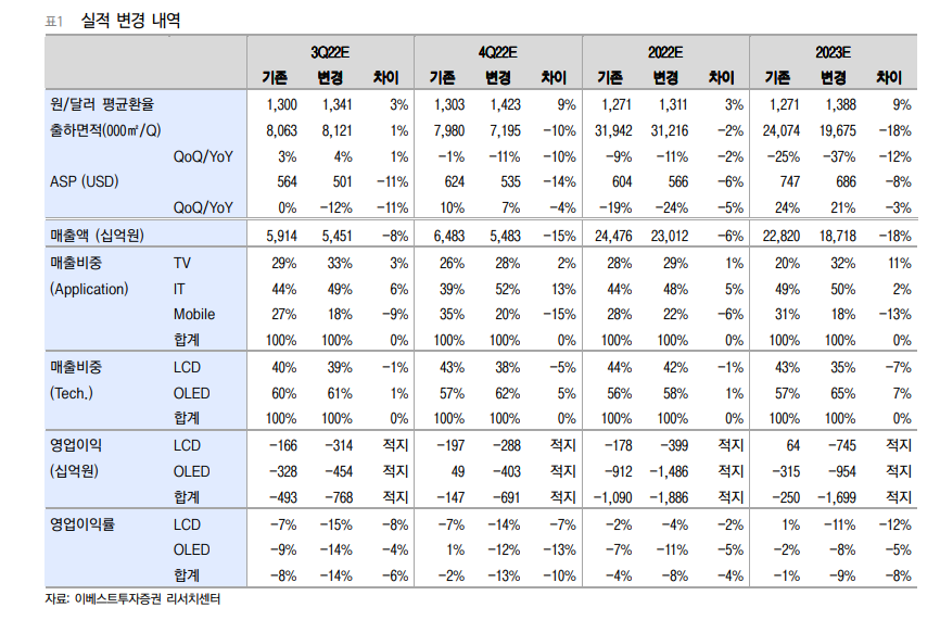 남 연구원은 “패널 가격 안정화 시점은 2023년 상반기가 될 것으로 예상하나, 2023년 재무구조에 대한 우려(2022년 2분기 말 기준 순차입금 14조 원, 순차입금비율 71%)가 부각될 수 있다”고 했다.