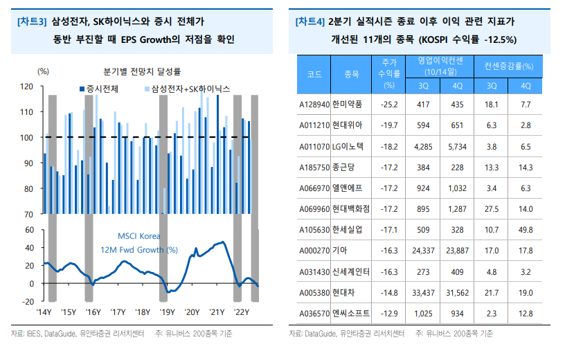 다만 그는 “긍정적인 점은 증시와 삼성전자, SK하이닉스가 모두 어닝쇼크를 기록하는 시점에 이익성장률(EPS Growth)의 변곡점이 확인됐다는 것”이라며 “실적 회복이라는 조건이 존재하지만, 향후 증시 분위기의 반전을 기대해 볼 수 있는 대목이라는 판단”이라고 했다.