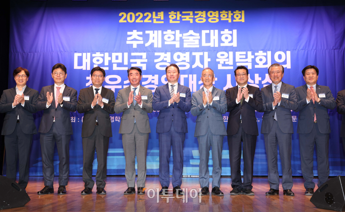 최태원 대한상공회의소 회장과 한상만 한국경영학회 회장 등이 17일 서울 중구 대한상공회의소에서 열린 ‘대한상의-한국경영학회 신기업가정신 확산 업무협약식’에서 기념촬영을 하고 있다.