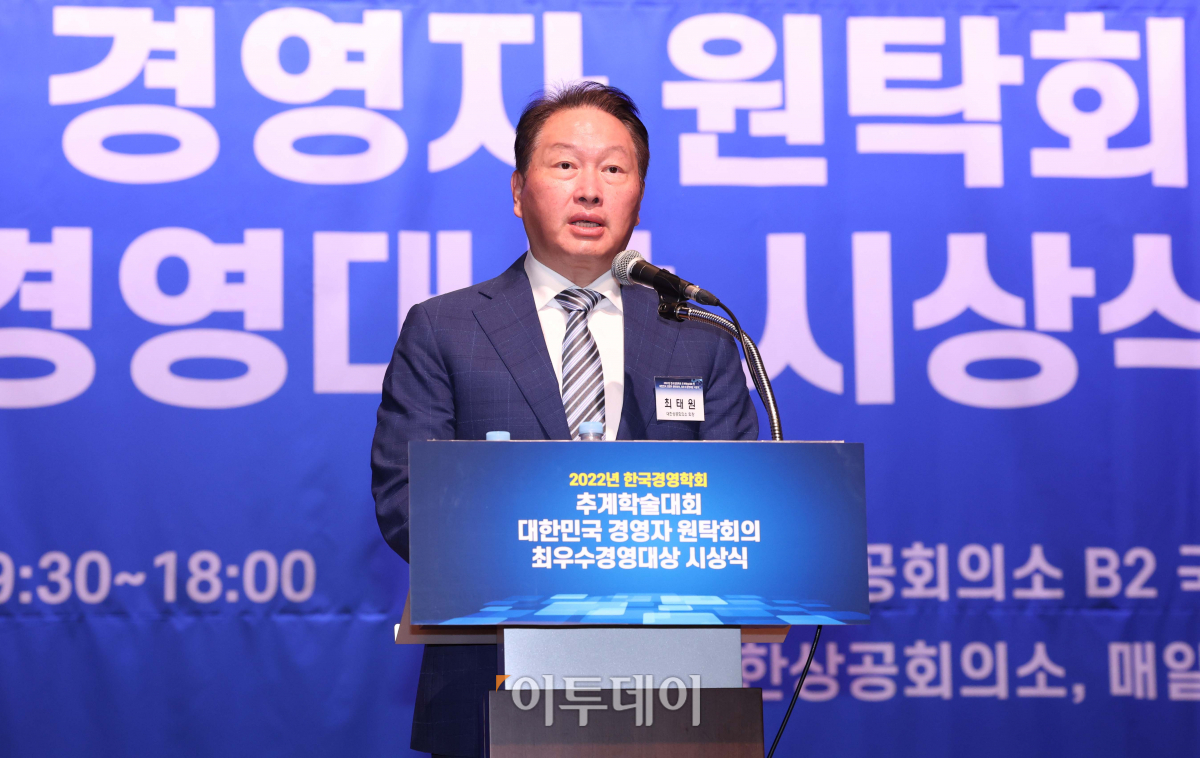 최태원 대한상공회의소 회장이 17일 서울 중구 대한상공회의소에서 열린 ‘대한상의-한국경영학회 신기업가정신 확산 업무협약식’에서 환영사를 하고 있다.