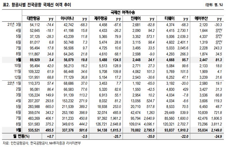 18일 정연승 NH투자증권 연구원은 “9월까지 국제선 여객 수송량은 코로나 이전인 2019년 평균 대비 26%에 불과하다”며 “대한항공 여객 수송량 인원 기준 32%, 거리를 감안한 화물수송량(FTK) 기준으로는 30% 회복되어 시장 대비 양호하다”고 분석했다.