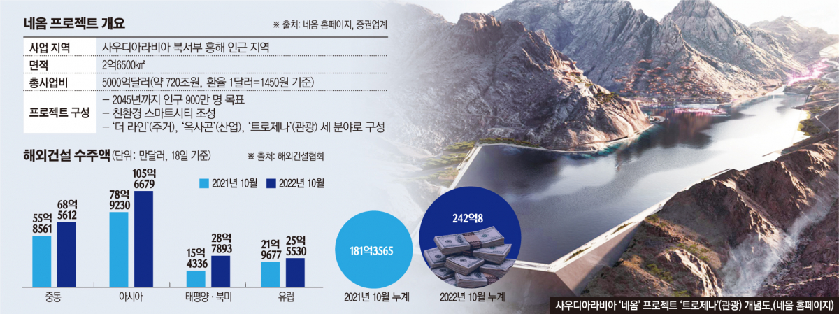 이렇듯 네옴 프로젝트발 초대형 공사 발주가 기대되면서 공사 규모와 수주 전망에도 관심이 쏠린다. 증권업계 분석에 따르면 지난달 말 기준 총 공사비 720조 원(5000억 달러) 가운데 발주 규모는 28조4000억 원(196억 달러)로 총공사 비용의 3.8% 수준에 그친다. 이마저도 조 단위(10억 달러 이상) 프로젝트는 단 세 건만 발주됐다. 네옴 프로젝트는 앞으로 초대형 공사가 쏟아질 ‘노다지’인 셈이다.