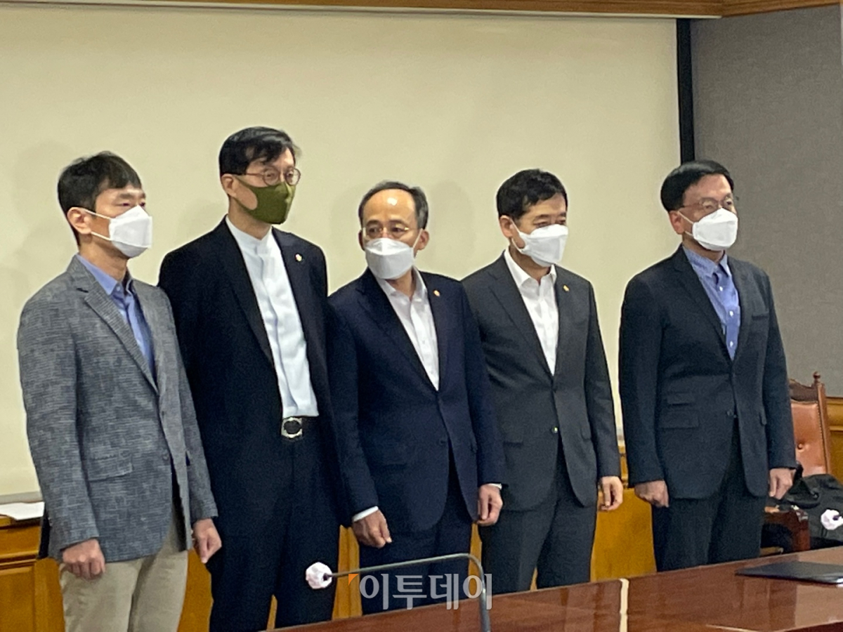 23일 낮 12시30분 서울 중구 명동 은행회관에서 열리는 비상 거시경제금융회의에 앞서 추경호(가운데) 경제부총리 겸 기획재정부 장관을 비롯해 이창용 한국은행 총재, 김주현 금융위원장, 이복현 금감원장, 최상목 경제수석이 기념촬영하고 있다.