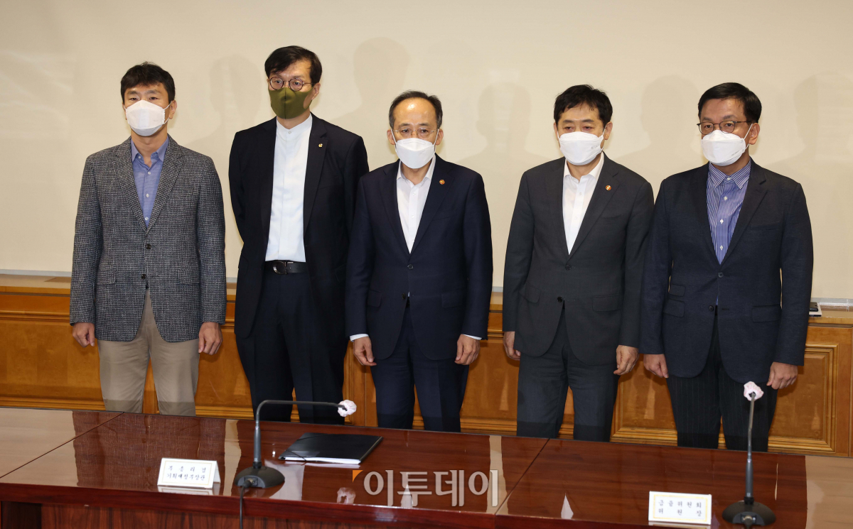 추경호 부총리 겸 기획재정부 장관 등 경제수장들이 23일 서울 중구 은행회관에서 열린 비상거시경제금융회의에 참석하고 있다. 왼쪽부터 이복현 금융감독원장, 이창용 한국은행 총재, 추 부총리, 김주현 금융위원장, 최상목 대통령실 경제수석.