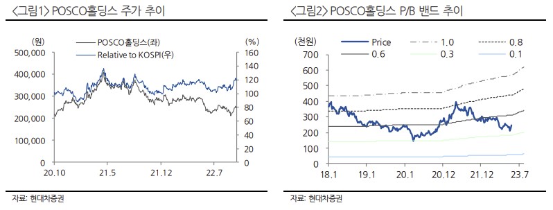 현대차증권은 25일 포스코홀딩스에 대해 하반기 국내외 철강 시황이 둔화되는 가운데 냉천 범람 침수피해(태풍 힌남노 영향)로 실적이 크게 부진하지만, 주가는 상당 부분 반영되었다고 판단된다며 투자의견 '매수'와 목표주가 33만 원을 유지했다.