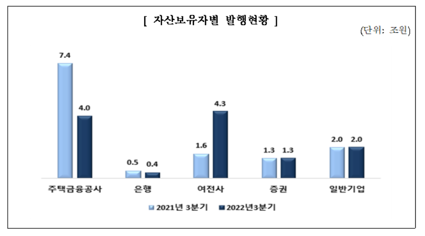 자산 보유자별로 보면 주택금융공사의 주택저당증권(MBS)은 전년 동기 대비 45.9% 감소한 4조 원을 기록했다.