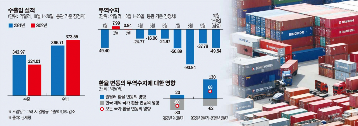올해 2~3분기의 글로벌 달러화 강세는 전반적인 교역을 위축시킨 가운데 같은 기간에 한국의 무역수지 적자를 60억 달러 확대하는 요인으로 작용했다. 또 원/달러 환율 상승은 같은 기간의 무역수지 적자 폭을 20억 달러 완화하는 데 기여한 것으로 분석됐다.