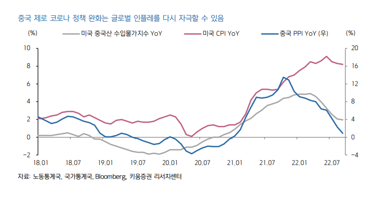 31일 홍록기 키움증권 연구원은 “글로벌 인플레 상승 국면에서 제로 코로나 정책, 즉 중국발 수요 둔화는 오히려 글로벌 인플레 압력을 일부 완화하는 데 일조했다”고 분석했다.