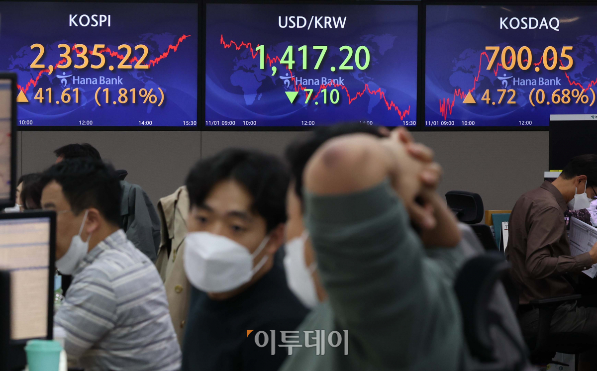 코스피가 외국인 매수세에 상승 마감, 한 달 반만에 2300선을 넘어 2330선을 기록했다. 1일 서울 중구 하나은행 딜링룸 전광판에 코스피가 전 거래일보다 41.61포인트(1.81%)오른 2335.22를 가리키고 있다.