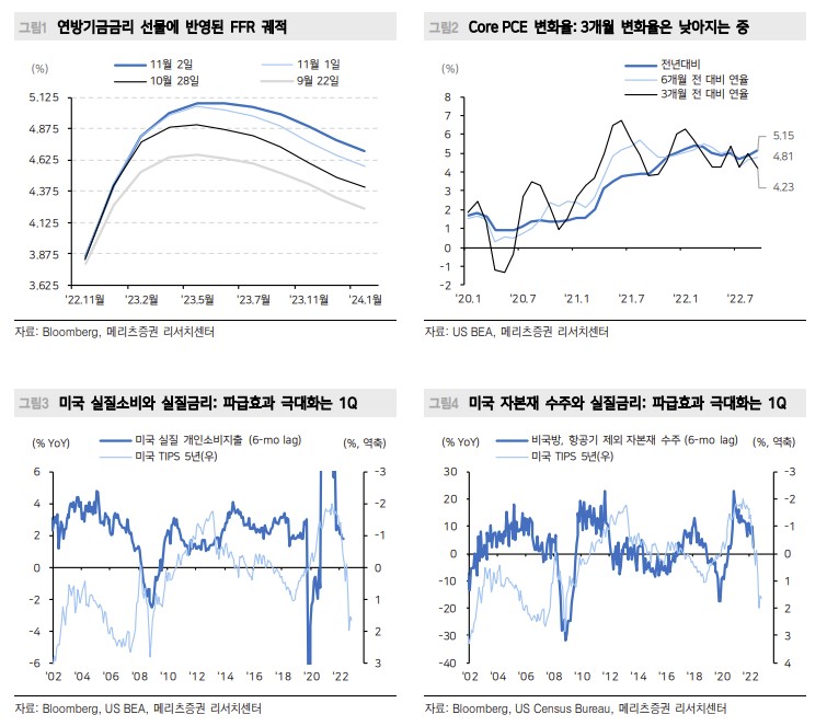 그러면서 "4분기를 필두로 인플레 압력의 유의미한 둔화 가능성이 남아 있기에 기존 종착점(2월 4.75%) 전망은 일단 유지한다"라며 "내년 2분기에는 Core CPI(4.6% 내외 예상)와 비교해서도 정책금리가 높은 수준에 있게 될 것으로 본다. 이 시각에 따르면 인상 종결 시점이 지연되더라도 1분기 말일 가능성이 높기에, 내년 1분기가 경기 및 시장 변곡점일 것이라는 전망은 유효하다"고 전망했다.