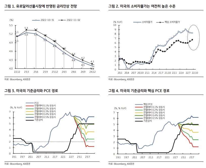 김 연구원은 "연준의 속도조절 시사로 12월 FOMC에서 50bp 인상 가능성이 높아졌으며, KB증권도 50bp 인상 가능성을 배제하지는 않는다"라며 "그러나, 12월 FOMC 전까지 2차례의 고용과 소비자물가가 발표되는 가운데, 고용시장은 여전히 견고하며 수요발 인플레이션 압력이 높아 핵심 인플레이션의 둔화를 확인하기 어렵다고 판단해 12월 FOMC에서 75bp 인상을 전망한다"고 봤다.