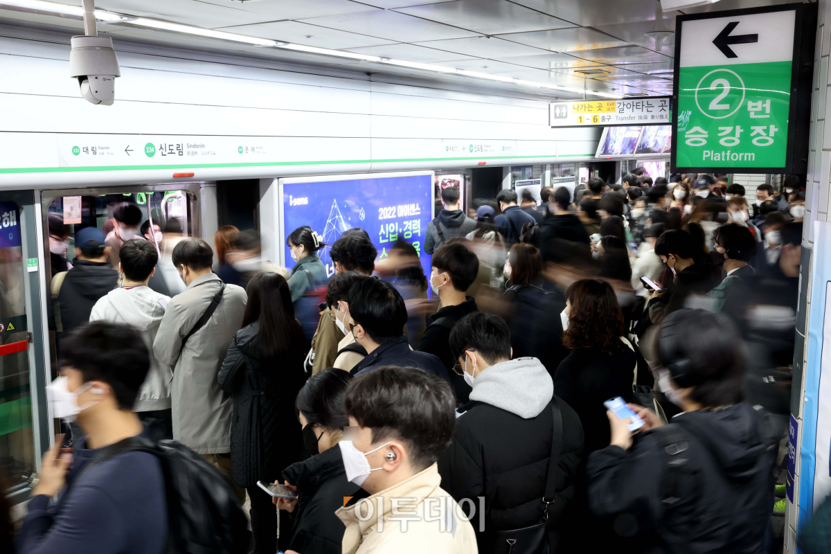 ‘이태원 참사’를 계기로 인구 과밀지역에 대한 우려가 높아지는 가운데 출퇴근길 지하철 밀집 현상에 대한 개선이 필요하다는 의견도 제기되고 있다. ‘콩나물시루’ 버스와 지하철 탑승에 익숙했던 안전불감증이 참사를 키웠다는 목소리도 나온다. 3일 오전 서울 신도림역 2호선 승강장에서 시민들이 발걸음을 옮기고 있다.