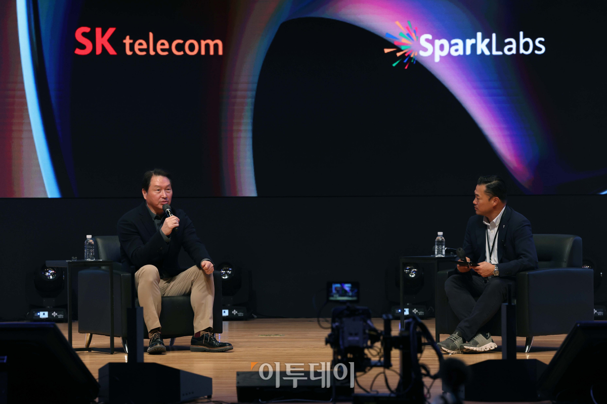 최태원 SK그룹 회장이 3일 서울 강남구 코엑스에서 열린 스파크랩 주최 데모데이에서 ‘미래 기업 가치 창출의 핵심: 고객과의 관계, 스토리, 그리고 신뢰’를 주제로 토크콘서트를 갖고 있다.