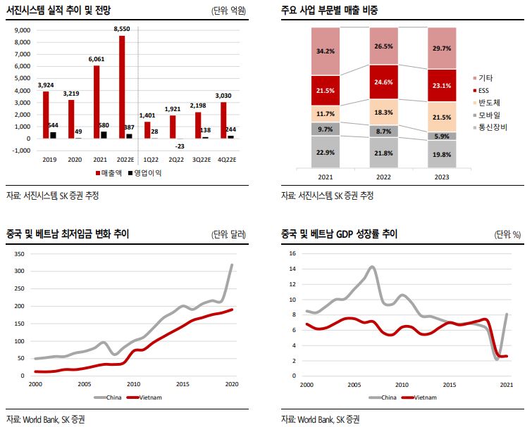 나 연구원은 “세계의 공장 역할을 하던 중국을 벗어나기 위한 글로벌 움직임은 더욱 가속화되고 있다”면서도 “탈중국 이후 뚜렷한 대안을 마련하기 어려운 글로벌 기업들 입장에서는 베트남과 서진시스템이 매력적인 대안으로 떠오르고 있고, 이는 서진시스템의 증가하는 거래처 숫자와 그들의 네임밸류에서 확인할 수 있다”고 했다.
