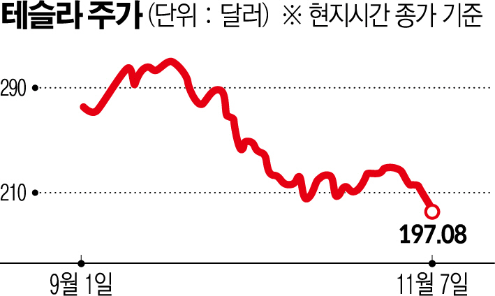 특히 주가는 머스크 CEO가 트위터 인수 작업을 마친 지난달 27일 이후 지금까지 12% 넘게 하락하고 있다. 이 기간 S&P500지수는 거의 변동이 없었고 나스닥지수 역시 1.9% 하락하는 데 그쳤다.