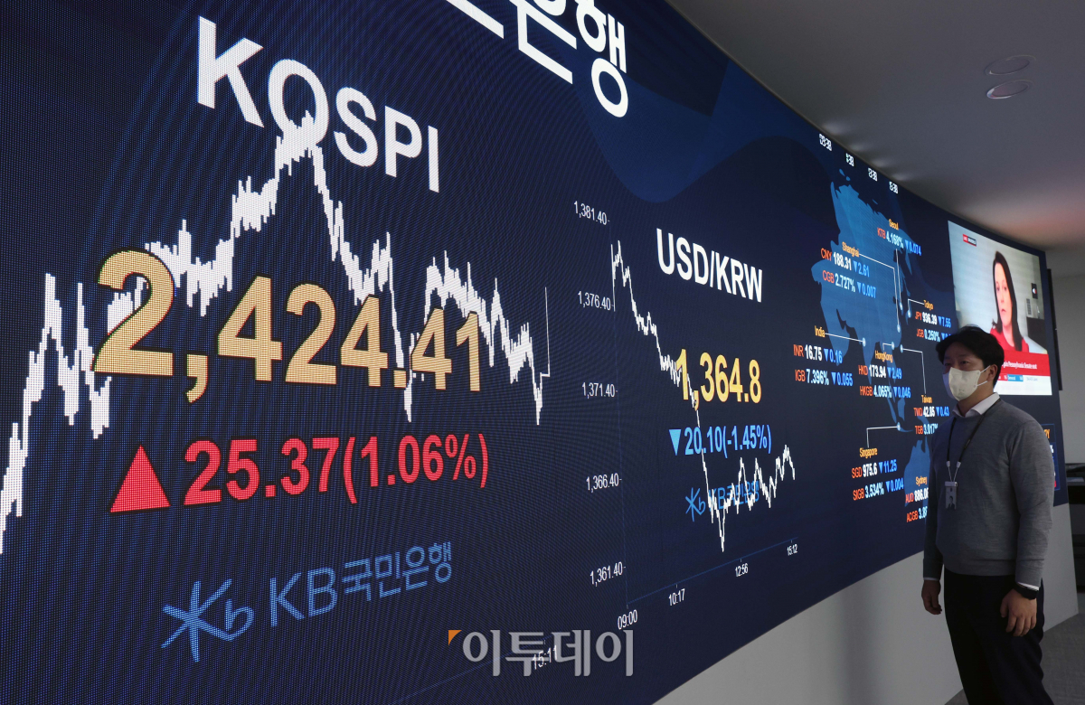코스피가 원화 강세에 외국인과 기관의 동반 순매수세가 이어지며 1% 넘게 올랐다. 코스피가 2400선 위에서 장을 끝낸 건 지난 9월 15일(2401.83) 이후 약 두 달 만이다. 9일 서울 여의도 KB국민은행 딜링룸 전광판에 코스피가 전 거래일보다 25.37포인트(1.06%) 오른 2424.41을 가리키고 있다.